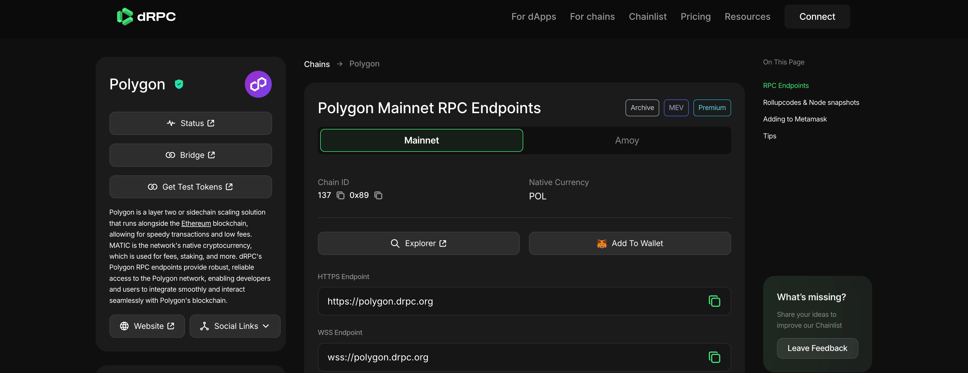 dRPC’s value proposition is clear: multi-chain access, WebSocket support, flat-rate request pricing, and distributed routing. Its Polygon documentation exposes standard chain info, subscriptions, and paid-tier trace methods.