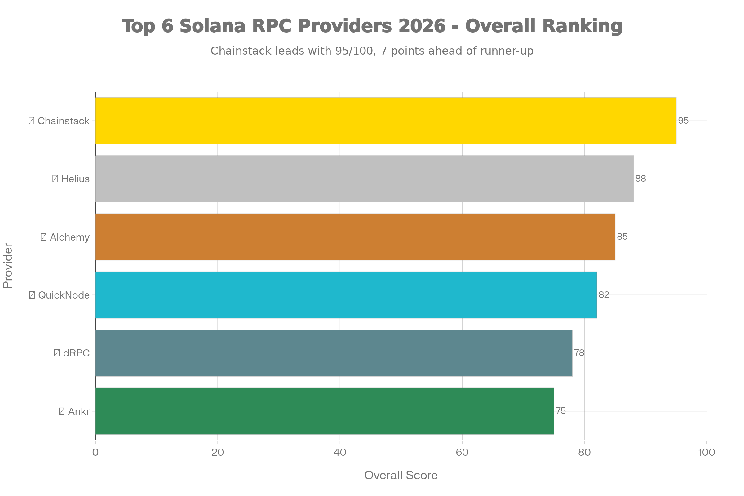 The 2026 Solana RPC landscape has matured into a competitive space with infrastructure options tailored to production-scale demands. Chainstack offers the most balanced solution overall, combining global and dedicated nodes, gRPC Geyser support, and 99.99% uptime — making it a strong fit for stablecoin payments, analytics, and enterprise deployments.