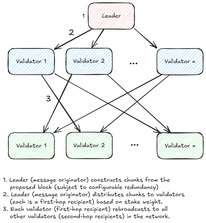 These validators then relay their chunks through a two-step process. The leader sends a chunk to the assigned validator, and the assigned validator then sends it to the rest of the network. The number of chunks each validator manages is proportional to its stake.