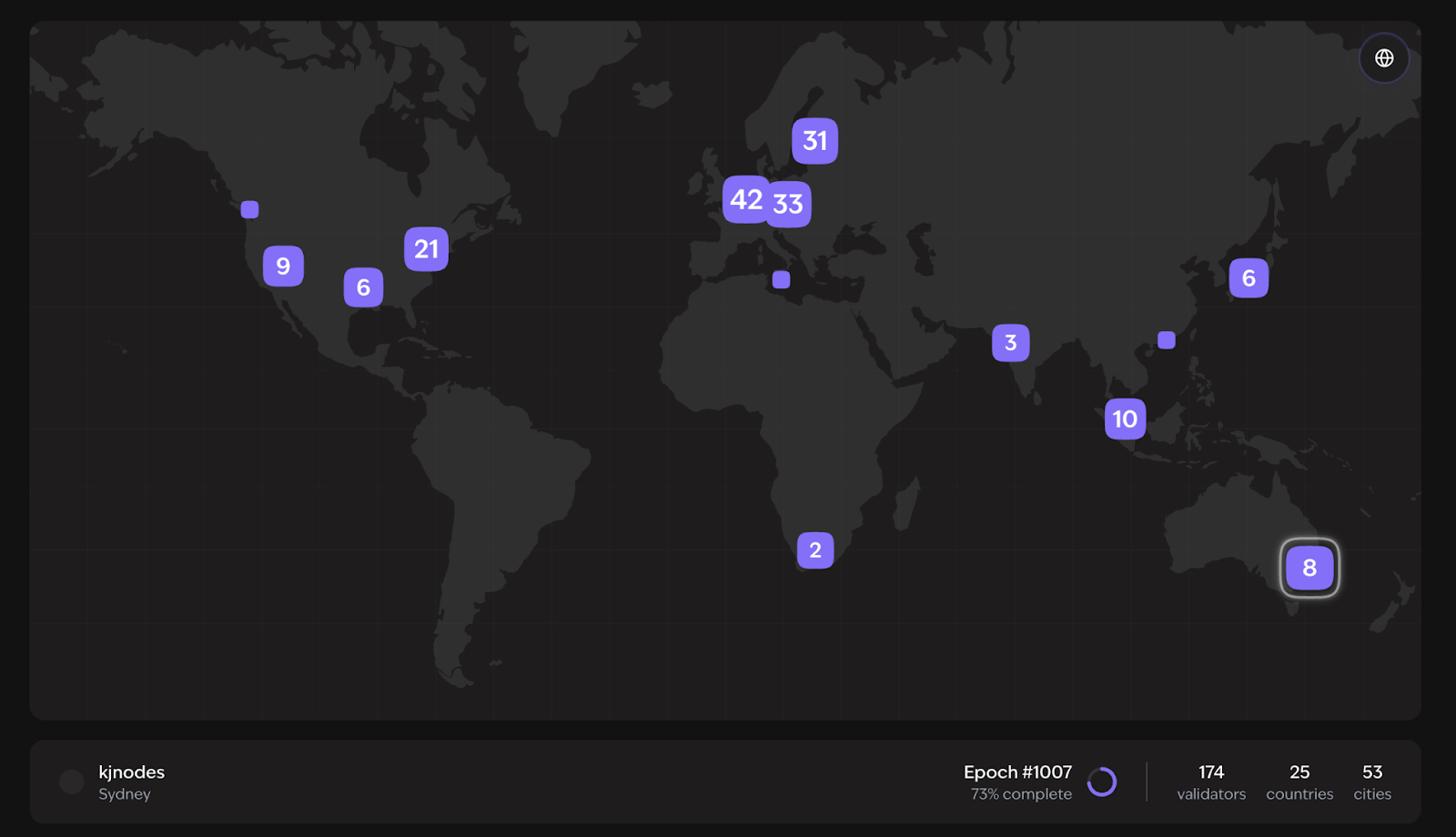 On the Monad testnet, 174 validators are spread across 53 cities in 25 countries, without any specific regional focus.