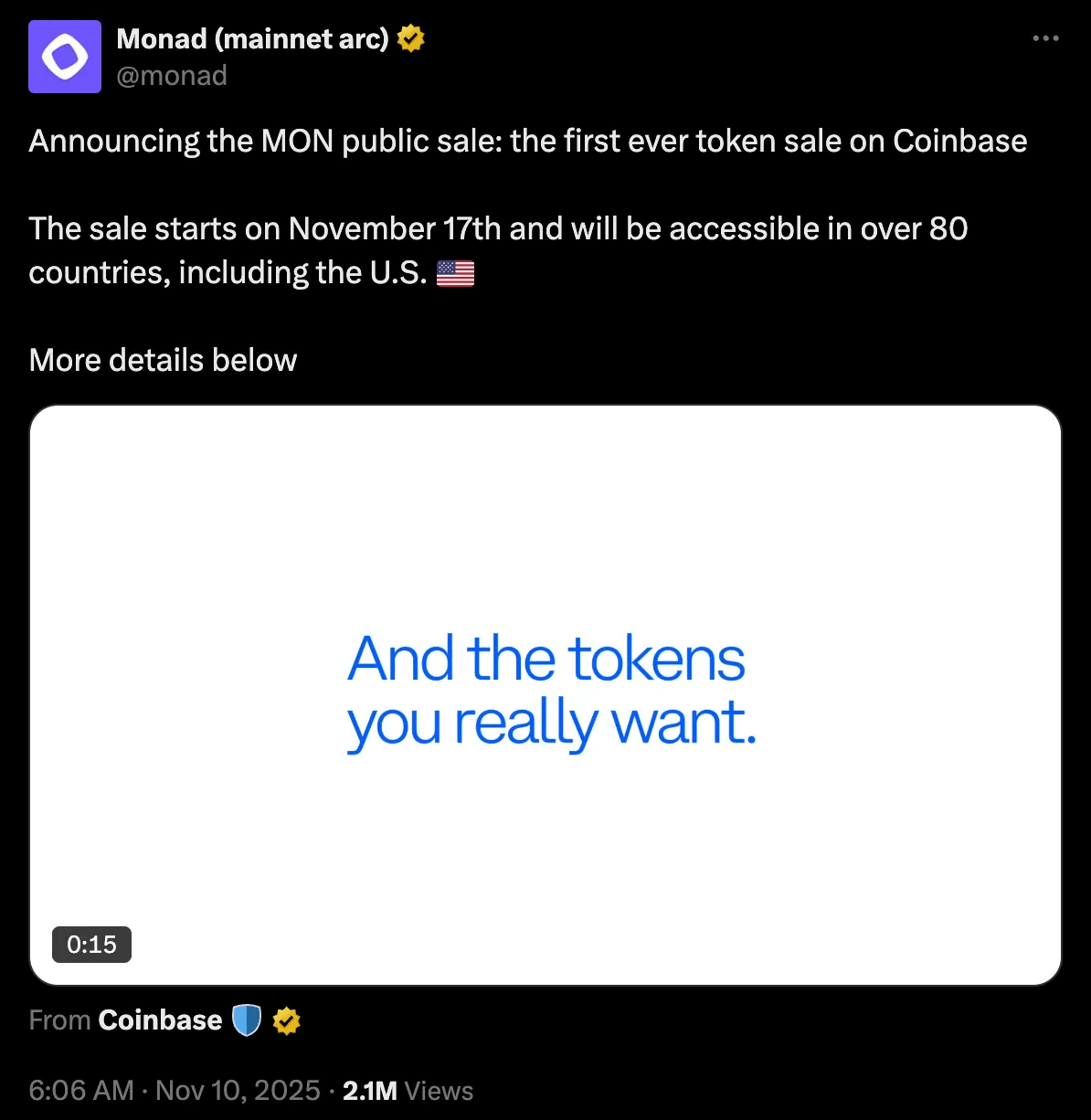 Earlier in November 2025, Monad attracted significant interest when Coinbase announced it as the first protocol token to launch on its Token Sales Platform.