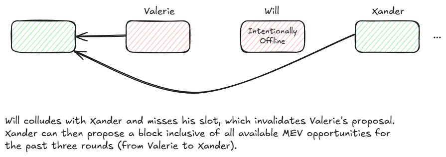 In standard Byzantine fault-tolerant systems, such as those on Ethereum, validators may collude by intentionally going offline or refusing to validate others’ proposals, leading to invalid block proposals. The subsequent validator can then reorder transactions within the block, facilitating a miner-extractable value (MEV) attack that is specifically called tail-forking.