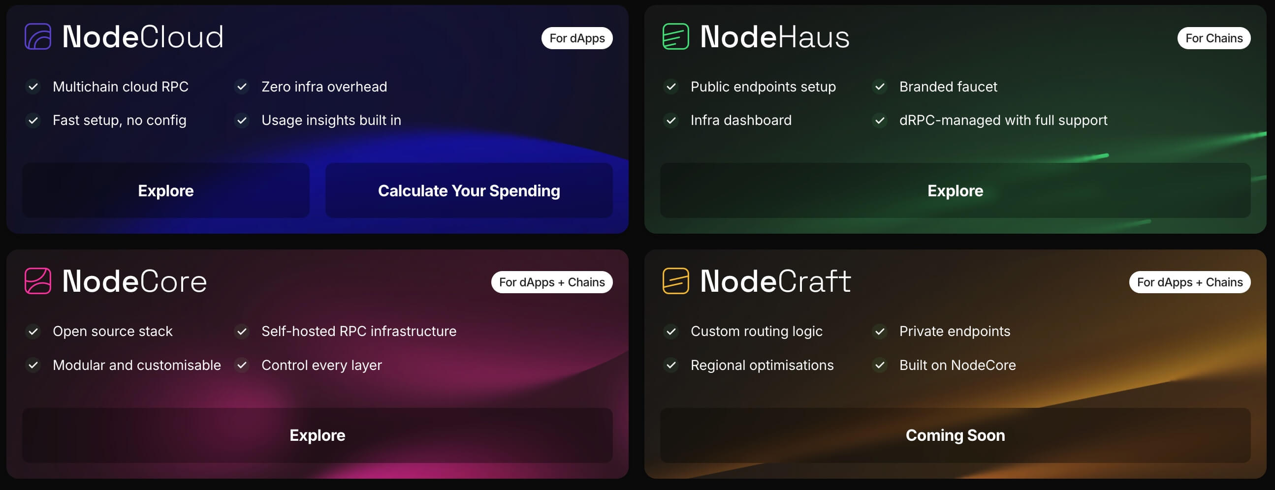 - NodeCloud: Ideal for teams that want instant access and minimal infrastructure overhead. Developers can connect to multichain endpoints in the cloud with no node-maintenance required.