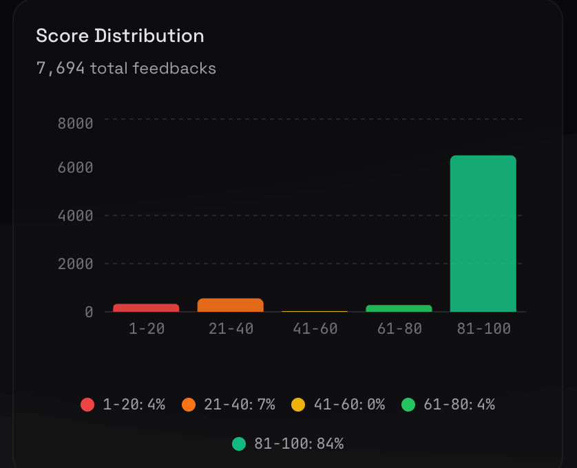 Agents are generally well-received by the Ethereum community. 84% of feedback, recorded in the Reputation Registries, received scores of 81-100 out of a total score of 100.