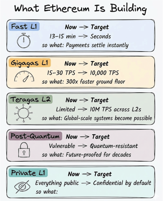 Fast L1 focuses on reducing finality times. The roadmap includes upgrades such as 2-second slots and one-round finality, both of which shorten the time between block proposals and validator attestations.
