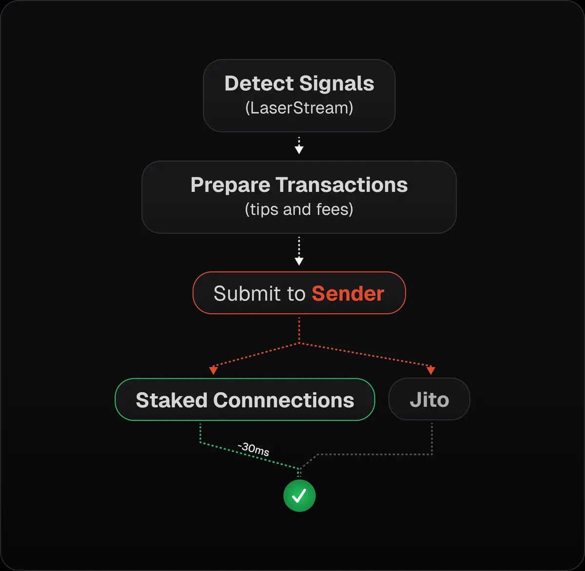 - Sender: submits in parallel to Jito and Helius across 7 regions; no credits billed, min 0.001 SOL tip; tuned parameters recommended for speed.