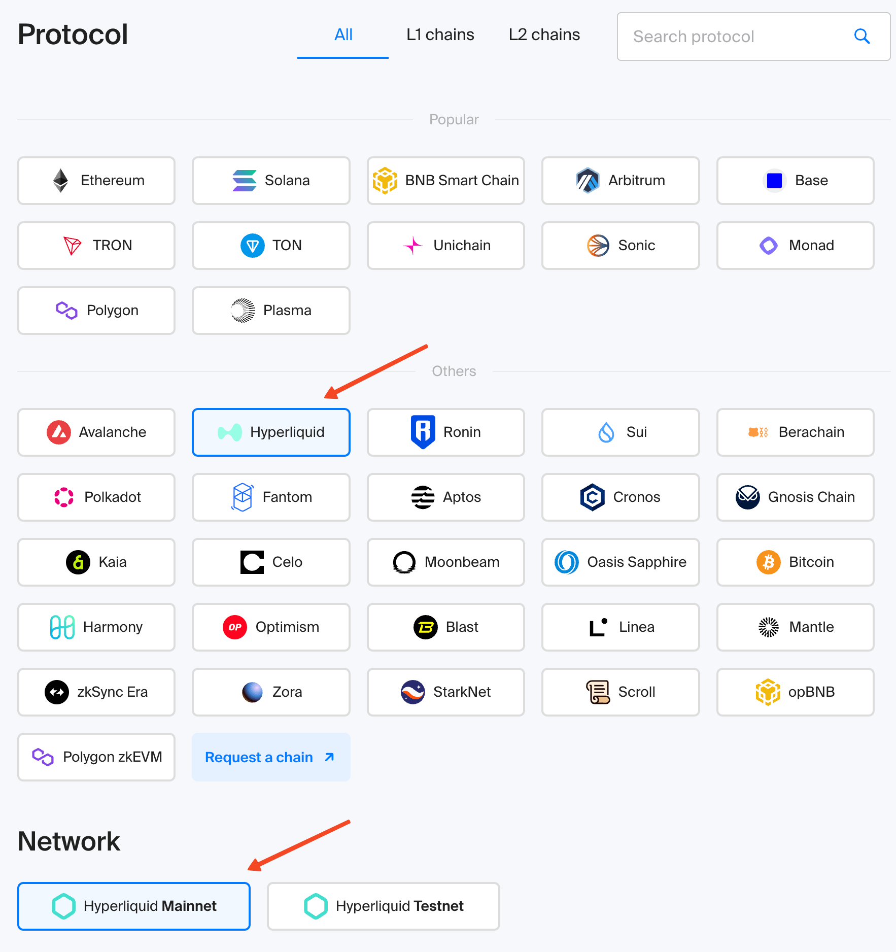 Choose Hyperliquid and then select “Hyperliquid Mainnet” in the network section below