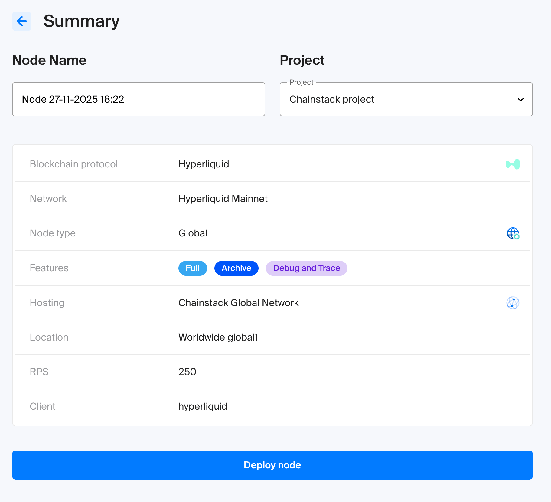 In the next step, select the type of node. For this project, choose “Global Node” Give your node a name, review all the settings in the summary, and click “Deploy Node”
