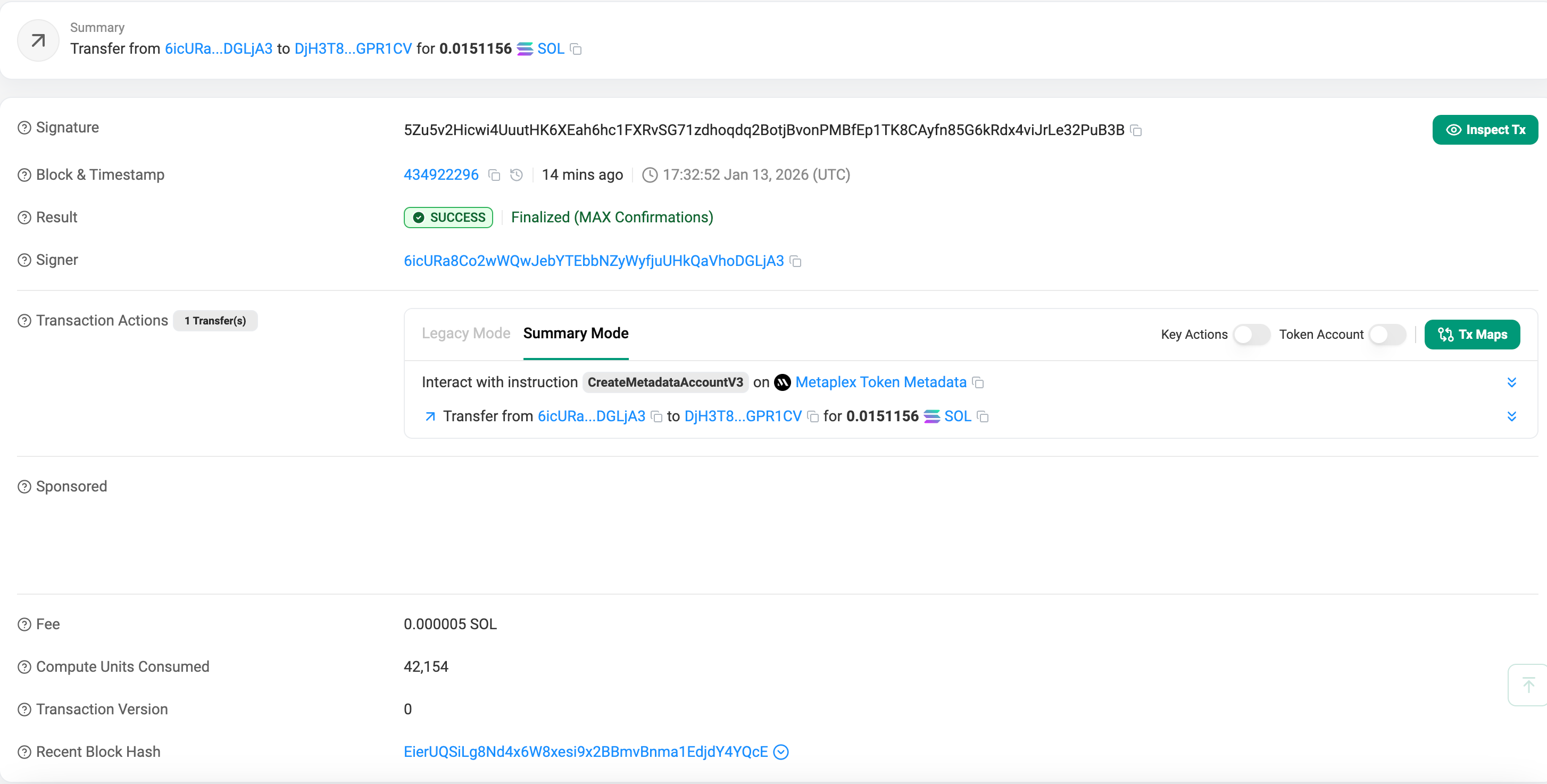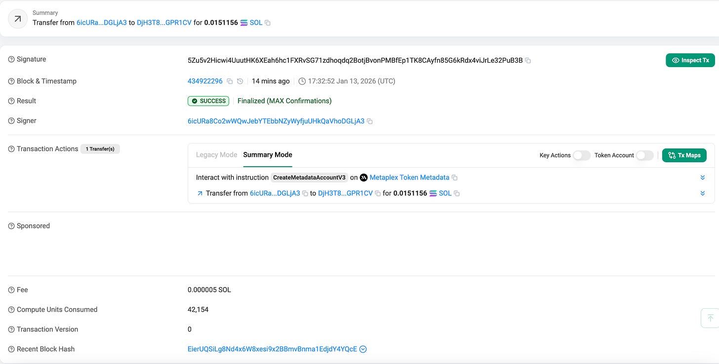 The metadata account contains structured fields such as the token’s name, symbol, URI, and update authority. From the token program’s point of view, none of this exists. From Metaplex’s point of view, this is the authoritative description of what the token represents.