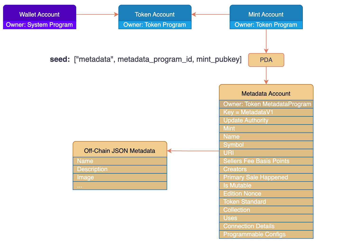 The relationship between a mint and its metadata is established through a deterministic derivation rule. Given a mint address, the metadata account can be derived as a Program-Derived Address using a fixed seed and the metadata program ID. This makes the relationship predictable without embedding any metadata logic into the token program itself.