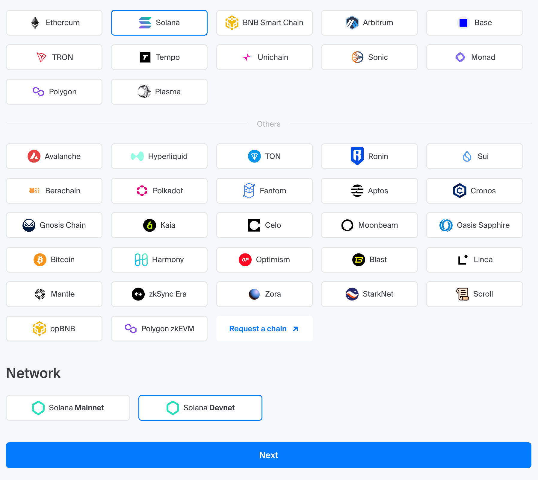 - Choose Solana and then select “Solana Devnet” in the network section below