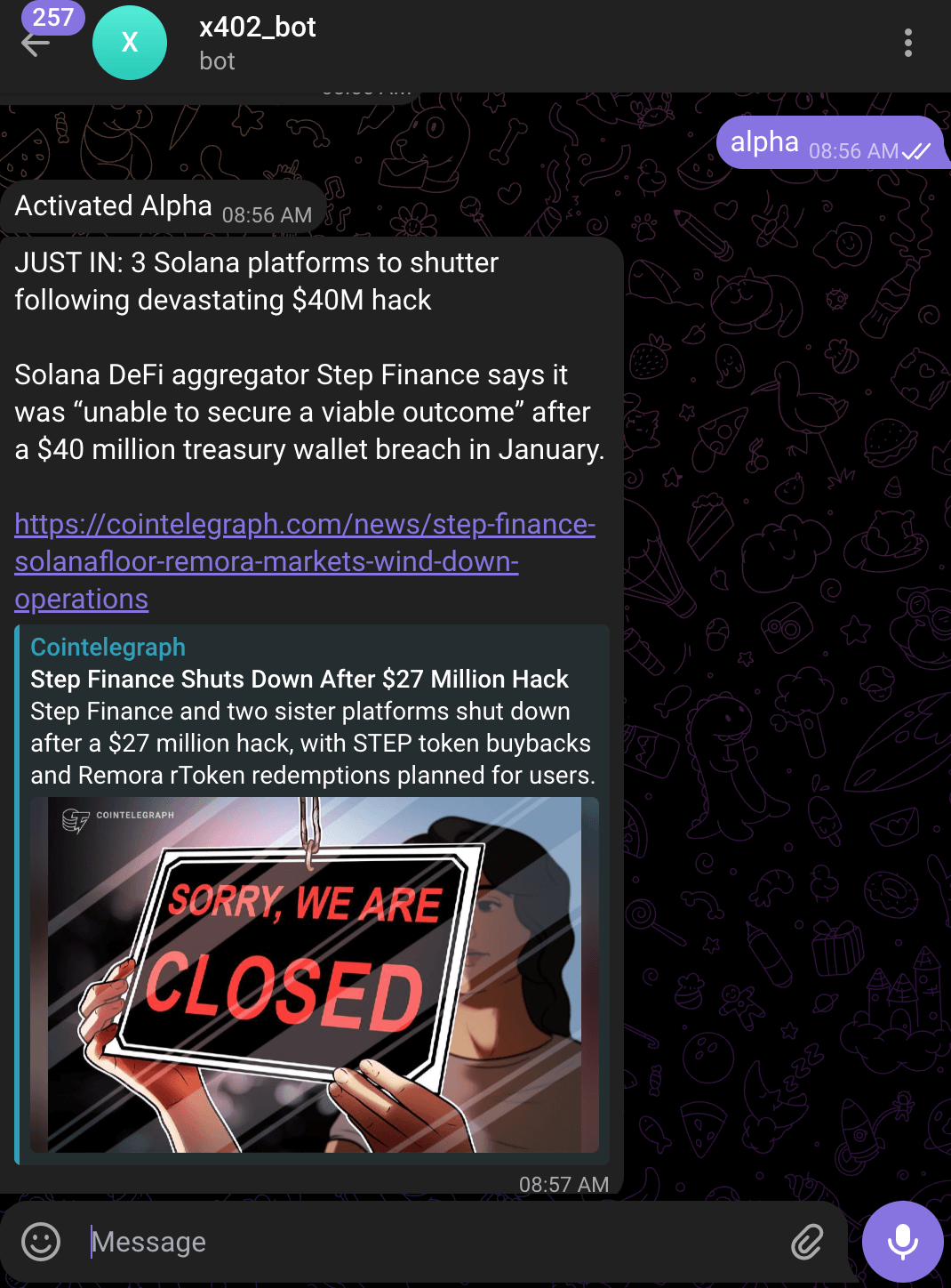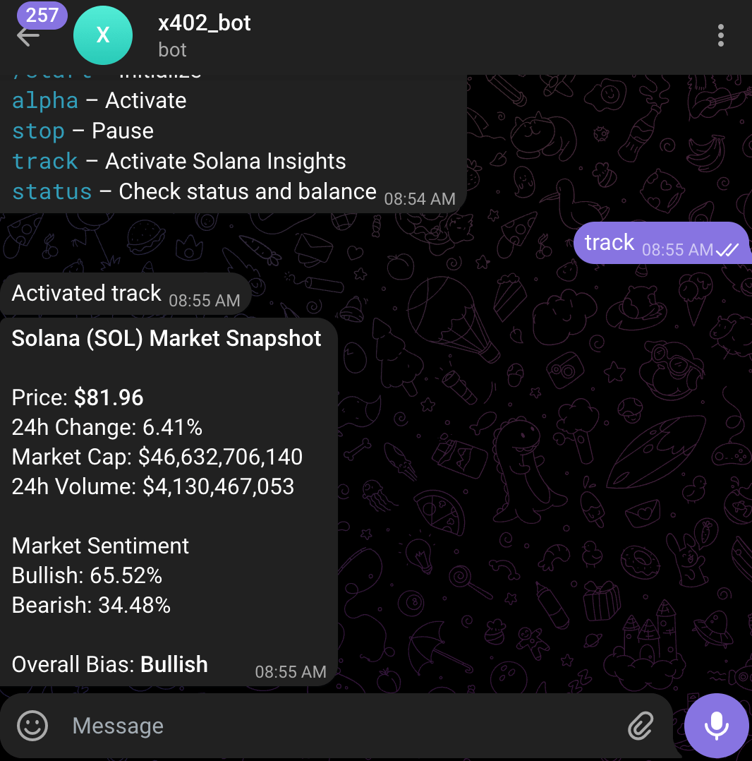 Optionally, send stop to terminate the bot from giving alpha and auto deduct payments via x402.
